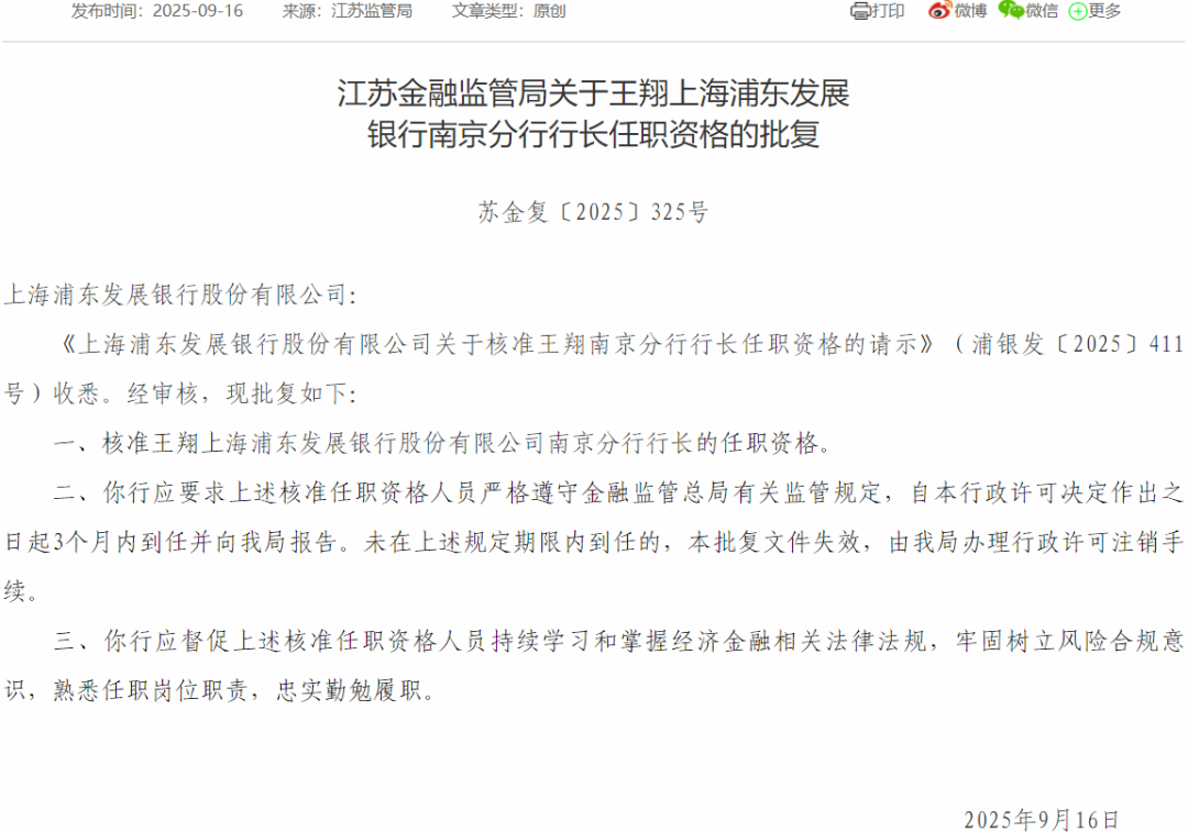 近日,江苏金融监管局官网发布《江苏金融监管局对于王翔上海浦东发展银行南京分行行长任职阅历的批复》,核准王翔上海浦东发展银行股份有限公司南京分行行长的任职阅历。